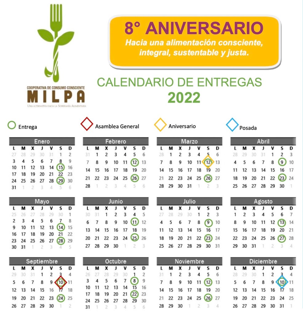 Las entregas las realizamos en día sábado cada quince días pudiendo tener ajustes a las fechas según la coincidencia con días festivos o periodos vacacionales. Para las personas interesadas en visitarnos, es recomendable estar al tanto de las fechas de entrega a través del sitio web y redes sociales, mientras que para los cooperativistas ya registrados los medios de comunicación interna para estar al tanto de las fechas son el correo electrónico y los mensajes de grupo en WhatsApp.