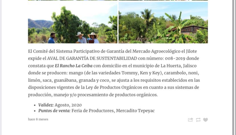 Adrían López forma parte de la cooperativa de consumo consciente Milpa. Cuenta con la certificación de “El Jilote”. Su producción, es orgánica. El JILOTE es un mercado virtual que vincula a productores avalados por un Comité Participativo de Garantía de Sustentabilidad que trabaja bajo principios participativos y que fomentan relaciones de confianza, además de promover los compromisos de salud, ecología, equidad y certidumbre ambiental. Su producción se encuentra en Cihuatlán, Jalisco. Brinda a la cooperativa una variedad de frutas entre ellas: